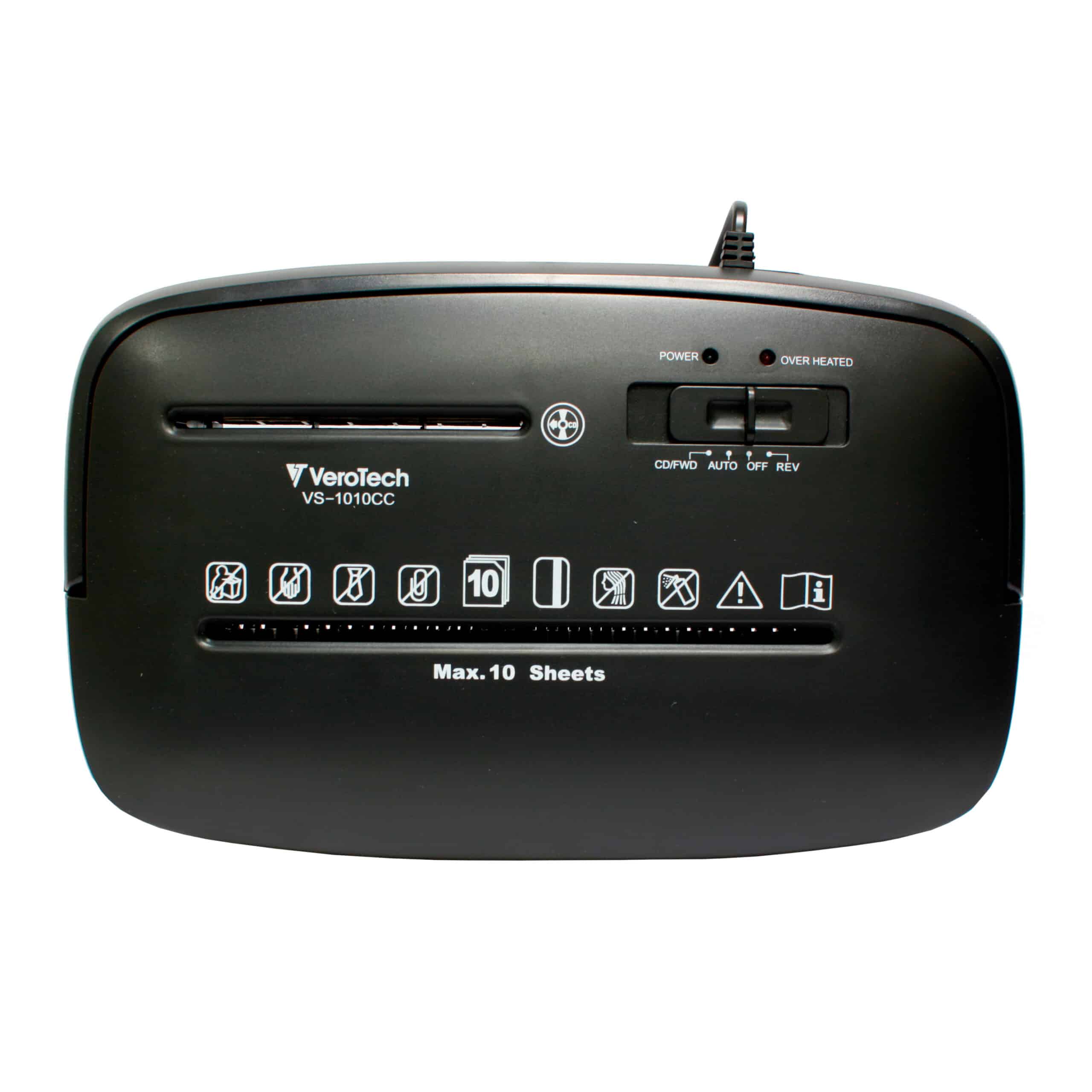 Verotech VS-1012CC to cicha i wydajna niszczarka ścinkowa (P-4), która niszczy do 12 arkuszy, płyty CD i karty, oferując 18-litrowy kosz oraz kompletny system czujników LED dla pełnego bezpieczeństwa.